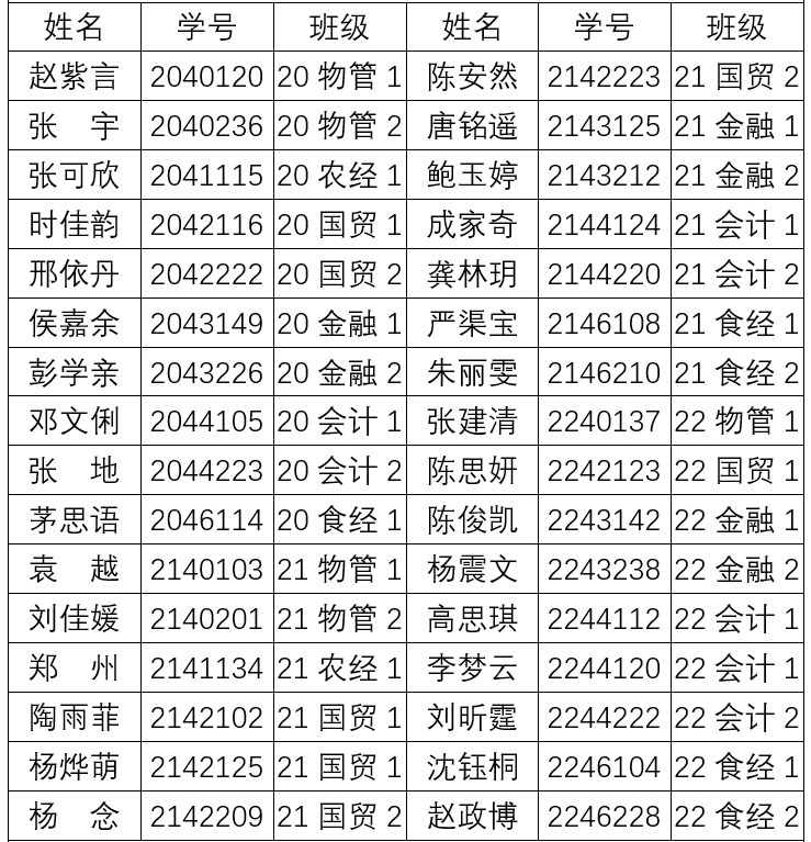 根据共青团上海海洋大学委员会下发《关于评选2022-2023学年上海海洋大学优秀学生干部、优秀学生标兵、优秀学生、社会工作积极分子、先进班级、文明班级的通知》,参照《上海海洋大学学生先进个人、先进集体评选实施细则》,经本人申请、班级评议小组评定、学院初审,2022-2023学年上海海洋大学经济管理学院“优秀学生干部”、“优秀学生标兵”、“优秀学生”、“社会工作积极分子”、“先进班级”、“文明班级”初选工作已完成,现将名单公示如下: