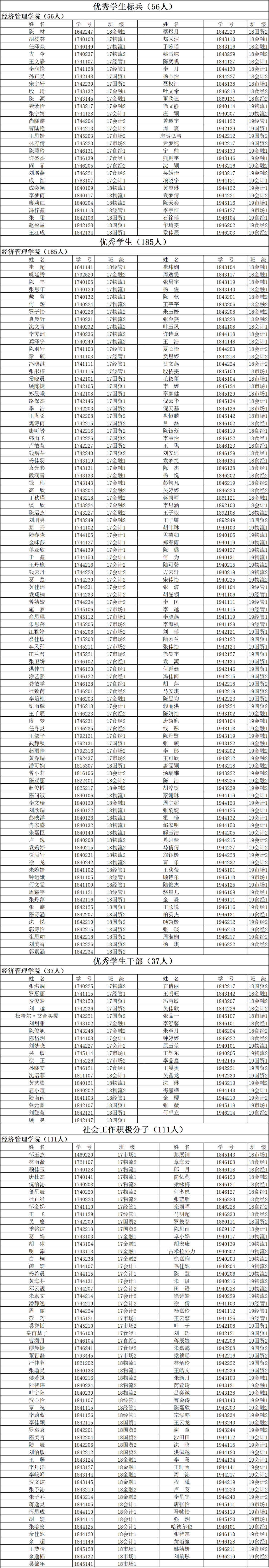 按照《上海海洋大学学生先进个人、先进集体评选实施细则》操作流程,经本人申请、学院初审,2019-2020学年“优秀学生标兵”、 “优秀学生”、“优秀学生干部”、“社会工作积极分子”、“先进班级”、“文明班级”名单如下所示: