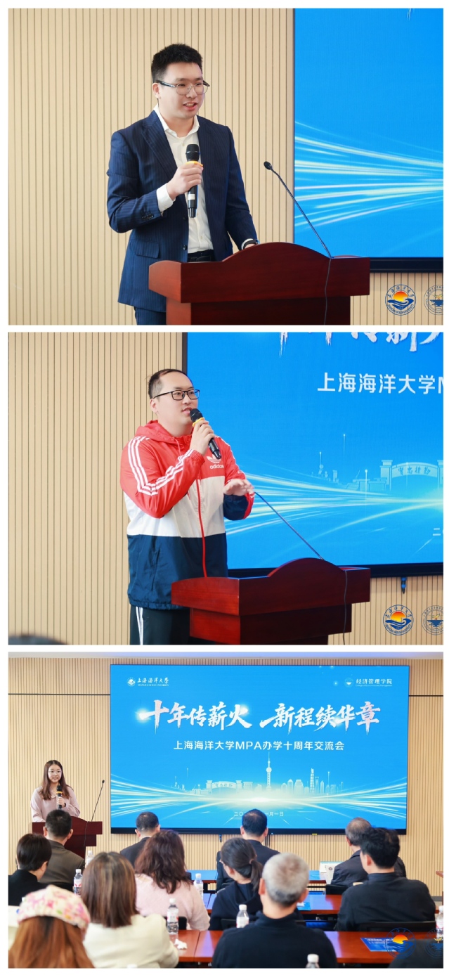 校友代表李俊前、安蒙、金於丹分别围绕“终身学习”“赋能成长”与“学以致用”主题,分享了各自的成长故事,带领与会者重温求学岁月。他们表示,上海海洋大学 MPA 教育不仅拓宽了专业视野,更重塑了人生格局,为职业发展注入持久动力。三位校友郑重承诺,将始终铭记并践行“勤朴忠实”的校训精神,在各自岗位上薪火相传、砥砺前行,以专业能力服务社会、报效国家。现场齐声高呼的“十年传薪火,新程续华章”,既是对过去十年的深情致敬,也是全体海大人面向未来的坚定宣言。