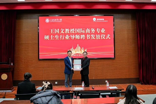 2025年12月12日,上海海洋大学经济管理学院举行国际商务专业硕士生行业导师聘任仪式,正式聘请著名供应链专家、美国供应链管理专业协会(CSCMP)中国首席代表王国文教授担任行业导师。经济管理学院院长杨正勇为王国文颁发聘书,并对其在行业标准建设、供应链人才培养及学科发展方面给予的长期支持表示感谢。