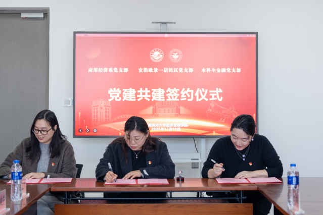 为深化区域化党建工作格局,推动高校智力资源与服务功能向社会基层延伸,促进校社党组织协同发展,2025年12月19日,中共南汇新城镇宜浩欧景一居民区支部委员会与中共上海海洋大学经济管理学院应用经济系支部委员会、中共上海海洋大学经济管理学院本科生金融支部委员会正式签署党建共建协议。此次共建是高校党组织主动融入地方、服务社会的重要实践,也是构建资源共享、优势互补、联动共赢的区域化党建新机制的有益探索。