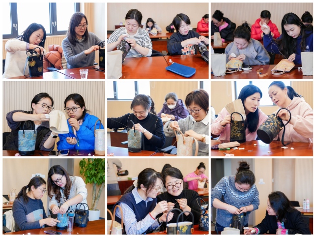 在专业非遗手工老师的细致讲解与指导下,老师们认真学习了牛皮材质特性、工具使用方法及基础制作技巧。大家专注凝神、巧手翻飞,互相交流心得、彼此协作,将匠心与巧思融入每一针一线,最终将普通的牛皮材料雕琢成一件件精致独特的专属牛皮包。活动现场暖意融融、欢声笑语不断,平日里坚守三尺讲台的女教师们化身心灵手巧的“手作匠人”,尽显巾帼风采。