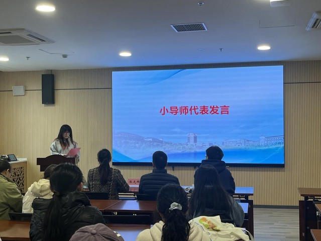作为小导师代表,2024级物流管理专业张一行分享了参与学业辅导工作的感悟。她回顾了与同学们围绕高等数学、概率论等难点课程开展答疑解惑的经历,讲述了从“羞于提问”到“主动求解”的转变中见证同伴成长的欣慰。她表示,辅导过程不仅是知识输出,更是自我提升的契机,在交流中既巩固了知识体系,也收获了与泰国留学生等同学的珍贵友谊。她代表全体小导师郑重承诺,将始终保持虚心好学的态度,坚守初心,主动关心同学,在互帮互助中携手进步,真正成为同学们学习路上可信赖、可依靠的同行者,为学院优良学风建设贡献力量。