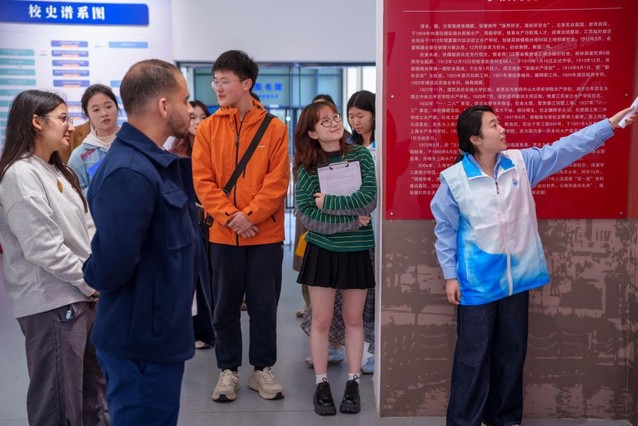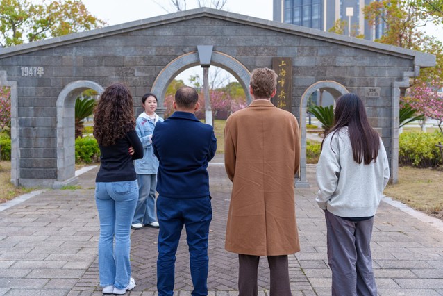 当日下午,剑桥学子沿着朝海路依次参观七道古朴校门,了解校名变迁与学校自1912年以来的百年历程。讲解中,他们得知张闻天曾在此求学并践行“勤朴忠实”校训,朱元鼎先生发现的鱼类咽骨被国际学界命名为“元鼎骨”时,多位学子发出赞叹。在《渔歌》雕塑、卷扬机与六分仪前,剑桥学子频频提问交流,感慨“这些凝固的历史,串联起的不仅是校名的更迭,更是一代代学子以海为志、以国为家的初心传承”。