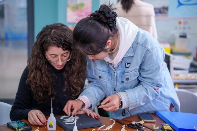 在第四小区活动室,鱼骨画社指导教师吴天琪带领剑桥学子体验鱼骨画创作。所用鱼骨均为学生实验后的剩余材料,体现了资源珍视与绿色环保理念。从铅笔勾线、选骨到粘贴,剑桥学生在动手实践中感受到中国文化的智慧与美学,现场气氛热烈。