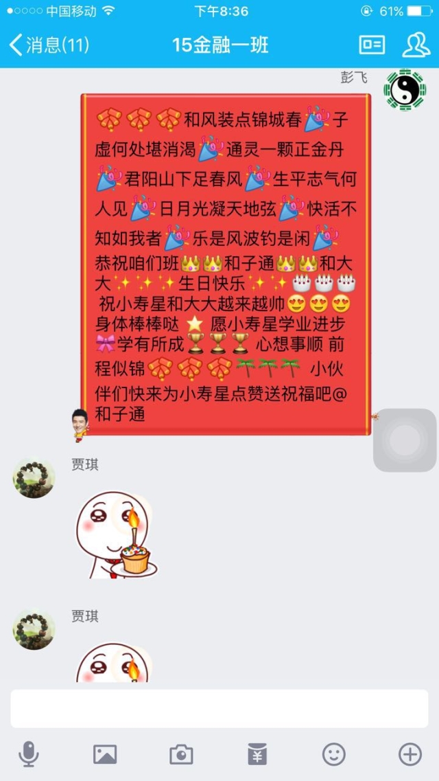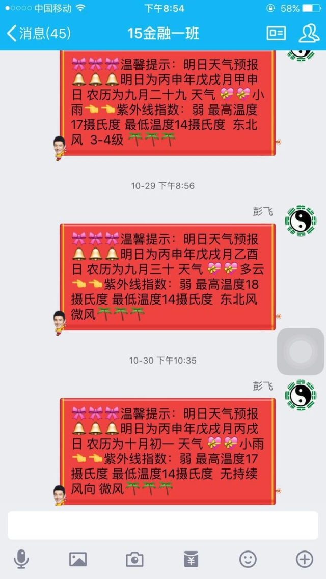 每天不忘在班级里发天气预报、每当同学生日都会在班群中送上真诚的生日祝福……这就是上海海洋大学经济管理学院2015级金融学1班的生活委员彭飞同学已经坚持了一年的习惯。他说:“在其位,谋其政,任其职,尽其责。不忘初心,方得始终。我还会一直坚持下去的。”