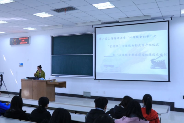 本次开机仪式特邀普陀区文化馆编剧邱懿君老师和岳渲影视负责人乔扬到场为参赛的同学做心理微电影的编剧及拍摄技术培训。邱懿君老师毕业于上海戏剧学院广播电视学专业,语言幽默风趣,培训内容丰富专业,从艺术思维、剧本的编写、地图原则、蒙太奇艺术到如何选取、拼接镜头,构思近景、中景、远景,让大家学习到运用画面讲故事的力量,并以“艺术,让人成为人”这一加纳罗的名言结尾,引发同学们的思考,使同学们得到了思想上的升华。岳渲影视负责人乔扬针对同学们拍摄心理微电影的实际需要为大家做了非常专业又浅显易懂的拍摄技术培训,让同学们在很短的时间内就掌握了拍摄的基本技巧。